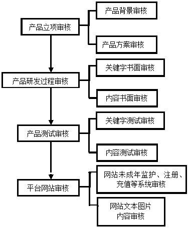 6.在产品公测前,对产品客户端、公司官网、产品官网进行审查,审查内容包括证照使用、实名注册、实名信息补填、用户协议必备条款、适龄提示、家长监护工程等内容,合格后方可公测;